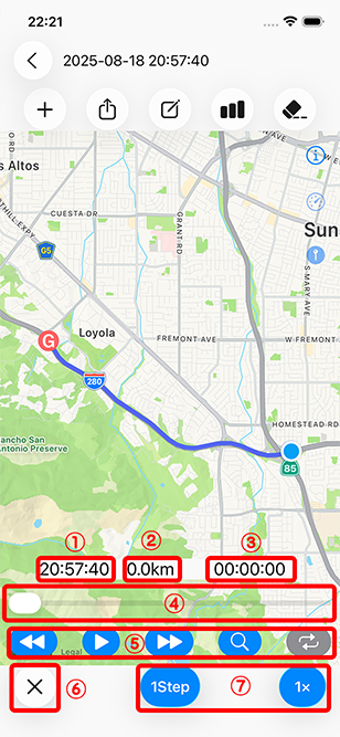 The selected log is displayed on the map when you select the log that you want to display from the list of logs and tap Button “Show” (2).