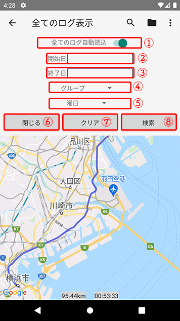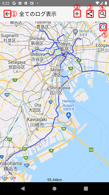 ③の「+」ボタンをタップするとログ記録画面が開き表示していたログの軌跡が赤色で表示されます。