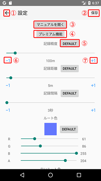 位置情報を取得する間隔になります。設定した間隔で位置情報を取得し、記録精度、記録距離の値をパスした位置情報のみログとして記録されます。